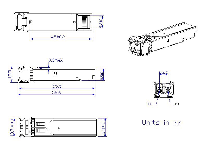 HTF'HTSF-B1G4955Xx Small Form Factor Pluggable (SFP) Transceiver sind kompatibel mit dem Small Form Factor Pluggable Multi-Sourcing Agreement (MSA),Der Transceiver besteht aus fünf Abschnitten: dem LD-Treiber, dem Begrenzungsverstärker,der digitale Diagnosemonitor, der DFB-Laser und der APD-Fotodetektor. Die Moduldatenverbindung bis zu 120km in 9/125um Singlemode-Faser.